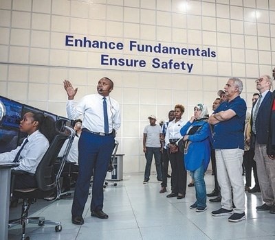 2023年10月6日,多國駐肯使節(jié)在肯尼亞內(nèi)羅畢的蒙內(nèi)鐵路內(nèi)羅畢站調(diào)度中心參觀。新華社記者 王冠森攝