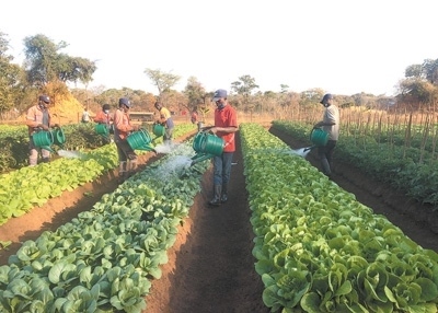 剛果(金)農(nóng)業(yè)種植培訓(xùn)示范基地的當(dāng)?shù)貙W(xué)員在為蔬菜澆水。北方礦業(yè)拉米卡公司供圖