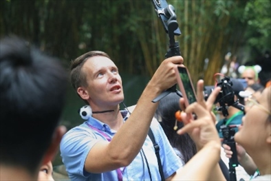 俄羅斯《俄羅斯報》視覺內(nèi)容編輯阿爾圖爾·杰魯諾夫在拍攝熊貓。(李佩藺 攝)