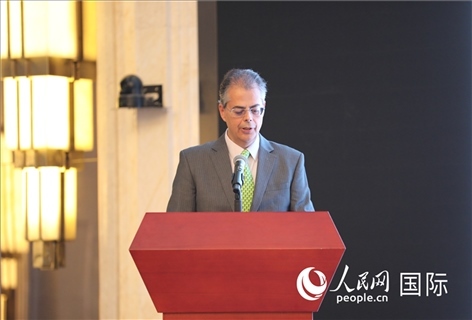 希臘駐華大使埃夫耶尼奧斯·卡爾佩里斯在影片放映前致辭。人民網 殷韜攝