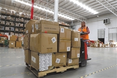美獅集團(tuán)墨西哥州海外倉內(nèi),一名員工從傳送帶取下貨物放到拖車上,準(zhǔn)備移動至智能上架區(qū)入庫。本報墨西哥分社 埃內(nèi)斯托·多明戈斯攝