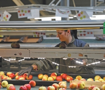波蘭格魯耶茨縣一家蘋果加工企業(yè)內(nèi),當(dāng)?shù)毓と苏诜謷O果。本報記者 禹麗敏攝