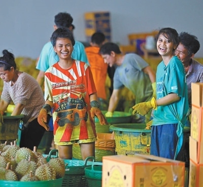 榴蓮是中國第一大水果進(jìn)口品類。據(jù)統(tǒng)計,2023年中國進(jìn)口142.6萬噸鮮榴蓮,其中92.9萬噸來自泰國。中國市場的強(qiáng)勁需求,帶動了泰國水果產(chǎn)業(yè)發(fā)展。泰國商業(yè)部數(shù)據(jù)顯示,2024年尖竹汶府的榴蓮產(chǎn)量預(yù)計突破56萬噸,同比增長超4.3%。同時,山竹、龍宮果等熱帶水果的產(chǎn)量也迎來了快速增長。“我推薦了不少親朋好友來水果加工廠上班,收入有保障,旺季的提成更是豐厚!”猜維開心地說。