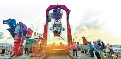 船時(shí)6時(shí)許(北京時(shí)間4時(shí)許),遠(yuǎn)處天際依然泛著青灰色,母船“深海一號(hào)”船上已是一片繁忙景象。作業(yè)區(qū)天氣晴朗,潛航人員和技術(shù)保障團(tuán)隊(duì)各司其職。一系列準(zhǔn)備工作就緒后,“蛟龍”號(hào)艙蓋關(guān)閉,深海之旅即將開啟。