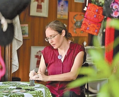 謝敏來(lái)自美國(guó)芝加哥,曾是一名英語(yǔ)老師的她,如今稱自己為設(shè)計(jì)師、小店店主。謝敏的小店叫“海島樂(lè)趣”,位于海南??诎咨抽T公園內(nèi)?!斑@是五指山市的黎錦手提包,這是保亭村子里的織品,那幾件是東方市的?!钡昀飻[放的黎錦作品出自海南各地村民之手,謝敏如數(shù)家珍。店中還有不少她親手設(shè)計(jì)和制作的文創(chuàng)產(chǎn)品,靈感都來(lái)自魚、烏龜、閃電等傳統(tǒng)黎錦紋樣。
