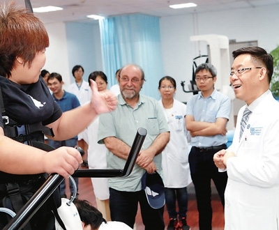 尼科萊利斯(中)與醫(yī)務人員共同指導截癱患者使用外骨骼康復機器人進行步行訓練。
