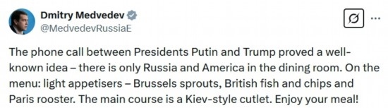 俄羅斯總統(tǒng)普京同特朗普18日通電話。俄聯(lián)邦安全會(huì)議副主席梅德韋杰夫就此表態(tài)稱,這表明餐廳里只有俄美,歐洲和烏克蘭都在菜單上,歐洲是開胃小菜,而主菜是烏克蘭。