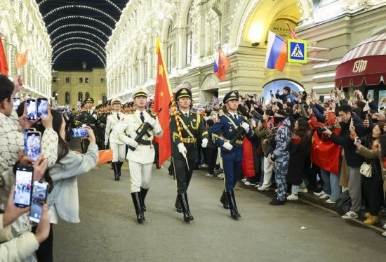 在4月29日和5月3日的夜間彩排中,中國方隊隊列整齊、精神飽滿,甫一亮相便引發(fā)轟動。眾多俄羅斯民眾、在俄華僑華人和中國留學(xué)生聚集在紅場附近,爭相觀看。
