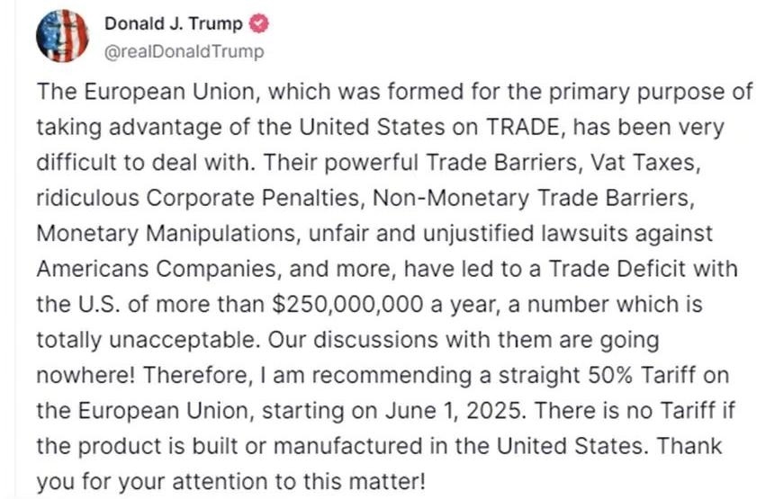 他說,美歐之間的磋商停滯不前。“因此,我建議自2025年6月1日起,對(duì)歐盟商品統(tǒng)一征收50%關(guān)稅。若產(chǎn)品在美國本土生產(chǎn)制造,則免征關(guān)稅?!?/p>