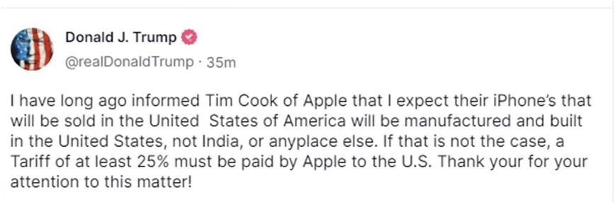 針對(duì)蘋果,特朗普說,他“很早之前就告訴過蘋果公司的(首席執(zhí)行官)蒂姆·庫克,我希望他們?cè)诿绹N售的蘋果手機(jī)是在美國生產(chǎn)和制造,而不是在印度或者其他什么地方”,“如果不是這樣的話,蘋果公司必須向美國支付至少25%的關(guān)稅”。