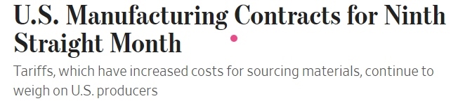 《華爾街日報》1日發(fā)表文章稱,美國供應管理協(xié)會(ISM)當天公布的調(diào)查報告顯示,11月美國制造業(yè)采購經(jīng)理人指數(shù)(PMI)已低于50的榮枯分界線。美國制造業(yè)活動連續(xù)第九個月萎縮,而美國制造商認為這主要是因為美國政府的關(guān)稅政策。
