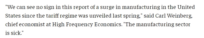 文章指出,美國政府曾辯稱,加征關(guān)稅是保護美國國內(nèi)制造業(yè)的必要之舉,但經(jīng)濟學家則認為,由于包括勞動力短缺在內(nèi)的結(jié)構(gòu)性問題,美國制造業(yè)已無法恢復昔日輝煌。文章援引高頻經(jīng)濟咨詢公司首席經(jīng)濟學家卡爾·溫伯格(Carl Weinberg)的話表示,“從(ISM)這份報告中,我沒有看到自關(guān)稅政策出臺以來,美國制造業(yè)出現(xiàn)任何增長的跡象,美國制造業(yè)已經(jīng)病了?!?/p>