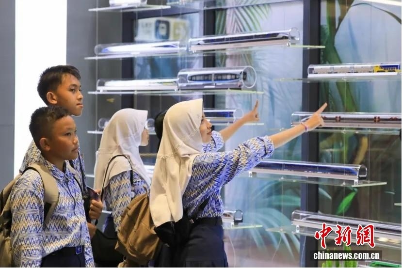 當?shù)貢r間2024年10月17日,一群印尼學生在印尼雅加達的雅萬高鐵動車組科普文化交流基地參觀。 中新社記者 李志全 攝