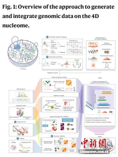 該論文介紹,人類染色體的三維組織結構,對于協調遺傳物質調控生物反應過程起到重要作用。DNA纏繞組蛋白形成名為染色質的復合體,存儲在細胞核內。大量染色質位點可通過生物化學修飾來調控基因表達。繪制這一三維結構及其如何經時(第四維度)改變的工作,被稱為4D核組學。