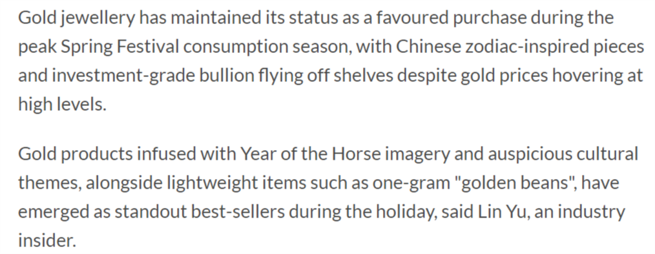 報(bào)道還稱,黃金珠寶在春節(jié)消費(fèi)旺季持續(xù)保持熱門(mén)購(gòu)買(mǎi)地位,盡管金價(jià)處于高位,但生肖主題設(shè)計(jì)的黃金飾品和投資級(jí)金條依然暢銷(xiāo)。報(bào)道援引業(yè)內(nèi)人士的話稱,融入馬年元素和吉祥文化主題的黃金產(chǎn)品,以及如一克“金豆”等質(zhì)量較輕的產(chǎn)品,在節(jié)日期間成為最暢銷(xiāo)的品類(lèi)。