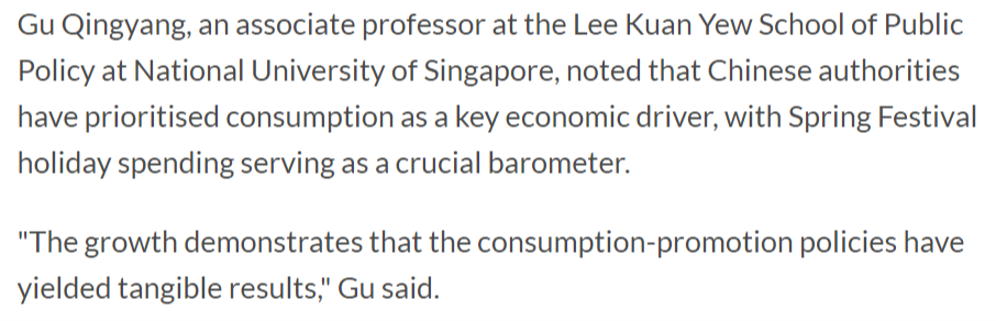 報(bào)道援引新加坡國(guó)立大學(xué)李光耀公共政策學(xué)院副教授顧清揚(yáng)的話表示,中國(guó)政府已將消費(fèi)列為關(guān)鍵的經(jīng)濟(jì)驅(qū)動(dòng)力,春節(jié)假期消費(fèi)則成為重要晴雨表。“增長(zhǎng)表明促消費(fèi)政策已取得切實(shí)成效?!?/p>