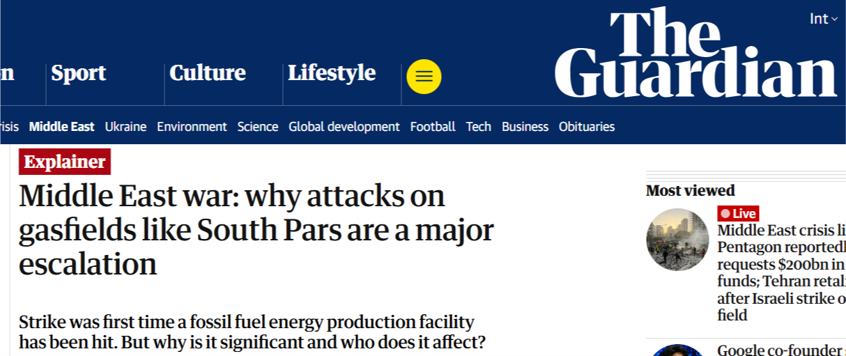 在以色列空軍當?shù)貢r間3月18日襲擊了位于伊朗南部布什爾市的伊朗“主要天然氣設(shè)施”后,19日,伊朗方面表示已發(fā)動“真實承諾-4”行動第63波攻勢,“焚毀”與美國相關(guān)的石油設(shè)施作為報復(fù)。相關(guān)聲明稱,伊朗同美國和以色列的戰(zhàn)爭已進入“新階段”。多家外媒指出,這是美以發(fā)動對伊軍事打擊以來,首次襲擊伊朗在海灣的能源生產(chǎn)設(shè)施,標志著戰(zhàn)爭的“重大升級”。