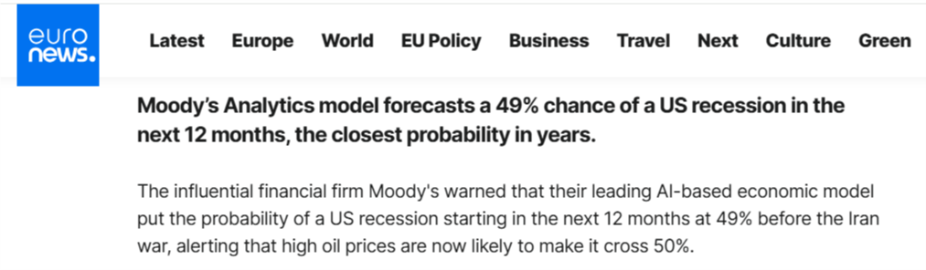 美政府接連出手的背后是疲軟的經(jīng)濟與通脹的預(yù)期無法承受高油價。而放任針對能源基礎(chǔ)設(shè)施的襲擊將進一步威脅全球能源供應(yīng),推高油價。目前美國汽油價格已飆升至自2023年以來的最高水平,而據(jù)歐洲新聞臺3月18日報道,穆迪分析(Moody's Analytics)模型預(yù)測,未來12個月內(nèi)美國經(jīng)濟陷入衰退的概率為49%,這是多年來最接近臨界點的一次。該模型還提醒稱,當前高企的油價很可能使這一概率突破50%。
