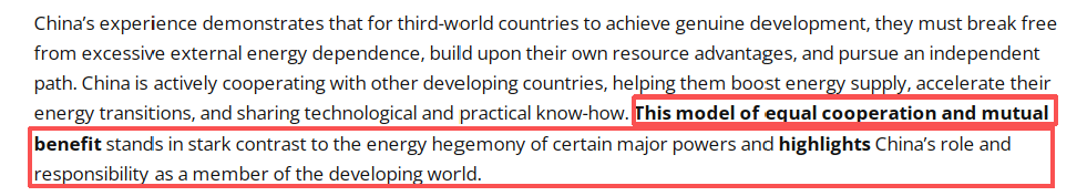 文章總結(jié)說(shuō),中國(guó)的實(shí)踐表明:發(fā)展中國(guó)家要實(shí)現(xiàn)真正發(fā)展,必須擺脫過(guò)度外部能源依賴,立足自身資源優(yōu)勢(shì)走獨(dú)立自主道路。中國(guó)正積極與其他發(fā)展中國(guó)家合作,通過(guò)技術(shù)共享、經(jīng)驗(yàn)輸出幫助其提升能源供給能力、加快能源轉(zhuǎn)型步伐。這種平等合作、互利共贏的模式,既區(qū)別于某些大國(guó)的能源霸權(quán)主義,也彰顯了中國(guó)作為發(fā)展中世界一員的責(zé)任擔(dān)當(dāng)。