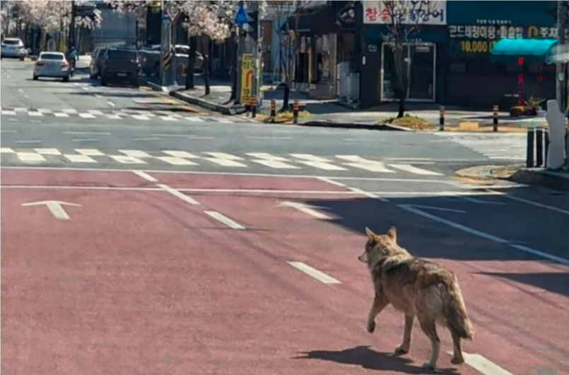 當(dāng)?shù)貢r間4月8日,大田消防部門提供的照片顯示,這匹在逃狼在大街上行走。圖源:韓媒