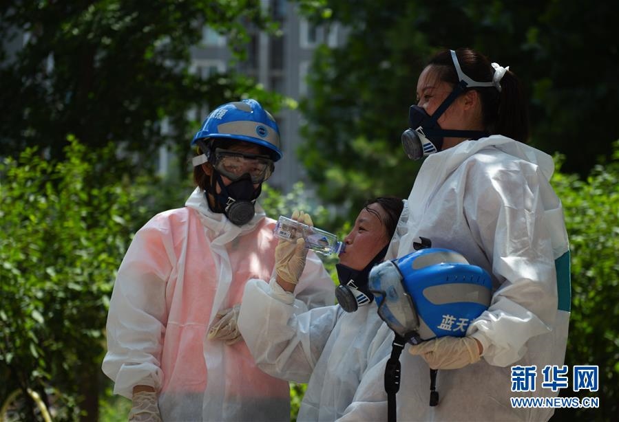 6月16日,北京藍天救援隊隊員在完成對豐臺區(qū)一居民區(qū)消殺作業(yè)后休息。連日來,北京出現(xiàn)高溫天氣??崾钪?,工作人員堅守抗擊疫情一線,成為烈日下的“逆行者”。新華社發(fā)(陳鐘昊攝)