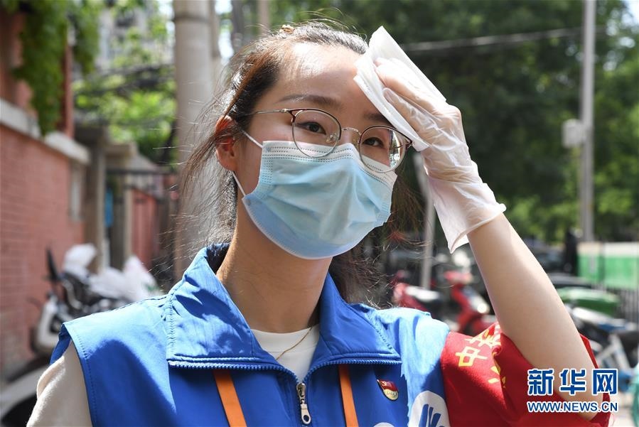 6月16日,在北京市海淀區(qū)中關村街道白塔庵社區(qū)出入口,疫情防控志愿者王玥在擦拭汗水。連日來,北京出現(xiàn)高溫天氣??崾钪?,工作人員堅守抗擊疫情一線,成為烈日下的“逆行者”。新華社記者任超攝