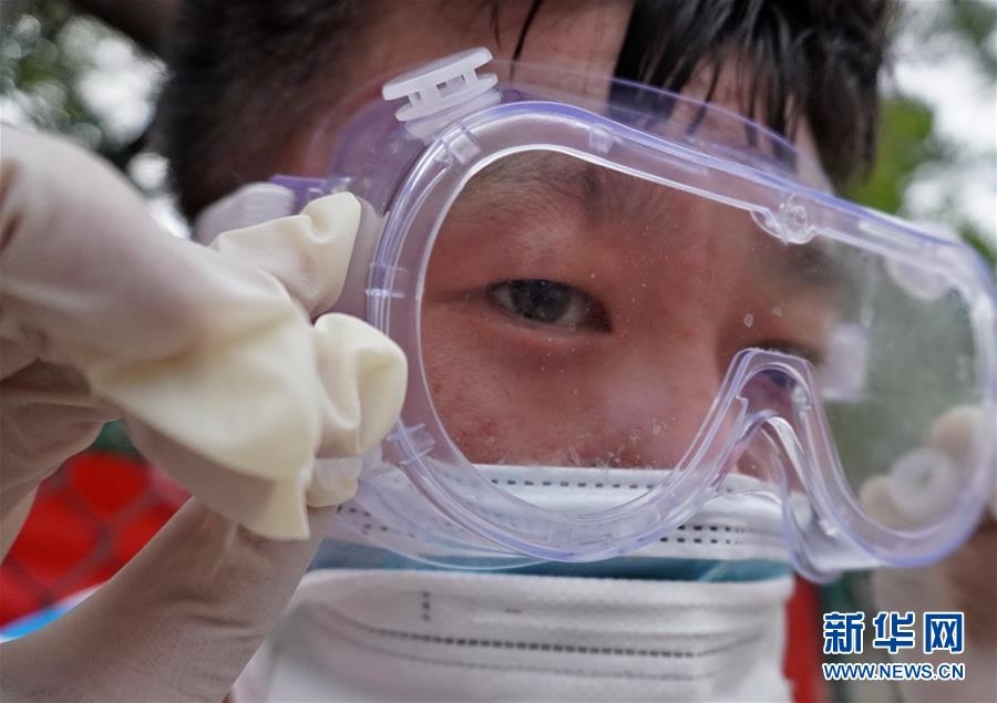 豐臺區(qū)東高地街道社區(qū)衛(wèi)生服務中心一位醫(yī)護人員的護目鏡內流進了汗水(6月15日攝)。連日來,北京出現(xiàn)高溫天氣??崾钪校ぷ魅藛T堅守抗擊疫情一線,成為烈日下的“逆行者”。新華社記者李欣攝