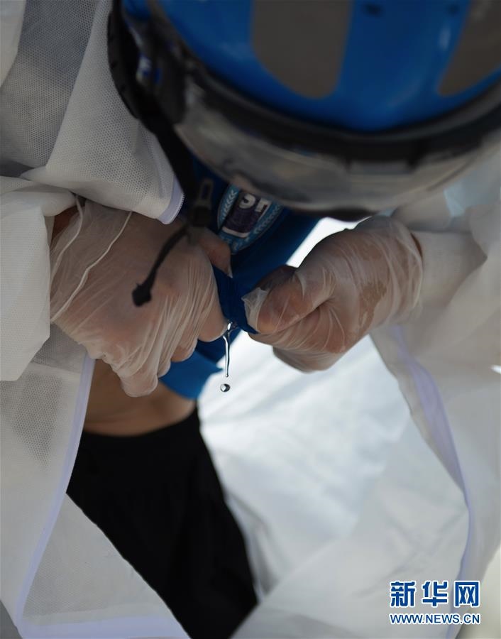 6月16日,北京藍天救援隊完成消殺任務后,一位隊員的衣服被擰出了汗水。連日來,北京出現(xiàn)高溫天氣??崾钪?,工作人員堅守抗擊疫情一線,成為烈日下的“逆行者”。新華社發(fā)(陳鐘昊攝)