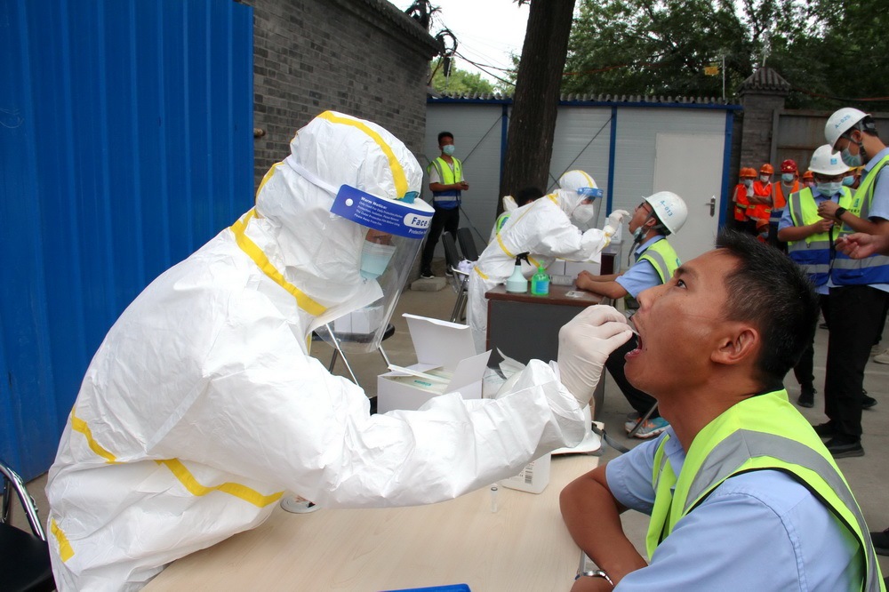 6月15日至17日,中建三局北京公司在京1042名職工做完核酸檢測(cè),同時(shí)公司邀請(qǐng)專業(yè)機(jī)構(gòu)為在建項(xiàng)目的上萬名勞務(wù)工人、安保及物業(yè)管理人員提供上門核酸檢測(cè)。新華社發(fā)(柯玉乾攝)