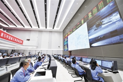 12月17日,工作人員在北京航天飛行控制中心嫦娥五號任務飛控現(xiàn)場觀看返回器攜帶月球樣品安全著陸。新華社記者 岳月偉攝