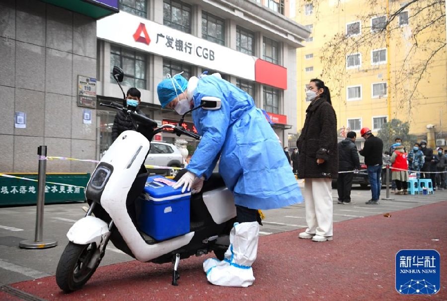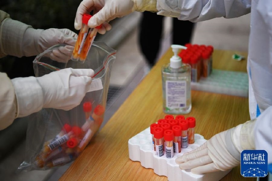 1月10日,在鄭州市緯一路核酸檢測點,醫(yī)護人員在封裝核酸樣本箱,準(zhǔn)備送檢。新華社記者郝源攝