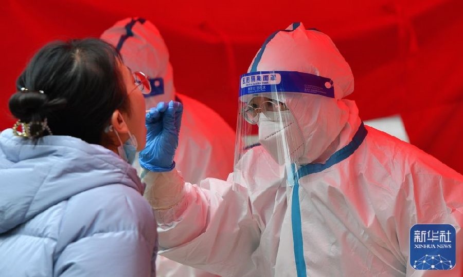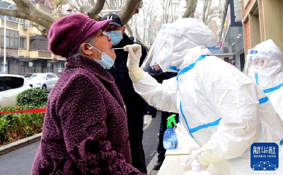 1月10日,在鄭州市二七區(qū)政通路一處核酸檢測點,醫(yī)務(wù)人員為市民進(jìn)行核酸檢測取樣。新華社發(fā)(丁友明攝)