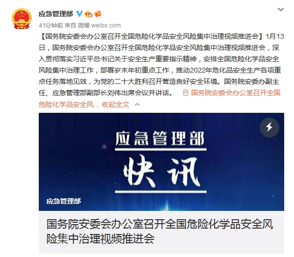 1月13日,國(guó)務(wù)院安委會(huì)辦公室召開全國(guó)危險(xiǎn)化學(xué)品安全風(fēng)險(xiǎn)集中治理視頻推進(jìn)會(huì),安排全國(guó)危險(xiǎn)化學(xué)品安全風(fēng)險(xiǎn)集中治理工作,部署歲末年初重點(diǎn)工作,推動(dòng)2022年?;钒踩a(chǎn)各項(xiàng)重點(diǎn)任務(wù)落地見效,為黨的二十大勝利召開營(yíng)造良好安全環(huán)境。