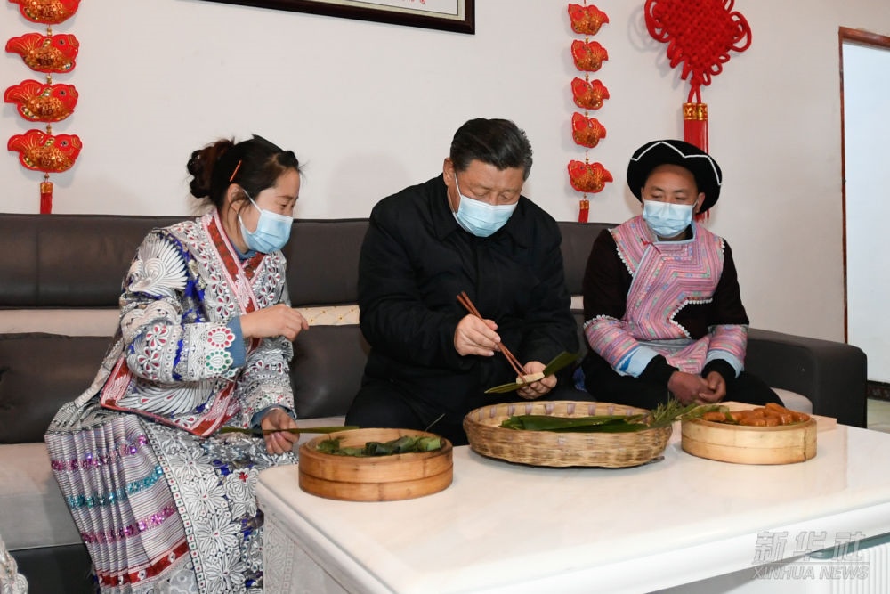2021年2月3日至5日,習(xí)近平來(lái)到貴州考察調(diào)研,看望慰問(wèn)各族干部群眾,向全國(guó)各族人民致以美好的新春祝福。這是3日下午,習(xí)近平在畢節(jié)市黔西縣新仁苗族鄉(xiāng)化屋村苗族村民趙玉學(xué)家,同趙玉學(xué)一家邊聊家常邊制作當(dāng)?shù)貍鹘y(tǒng)節(jié)日食品黃粑。