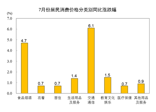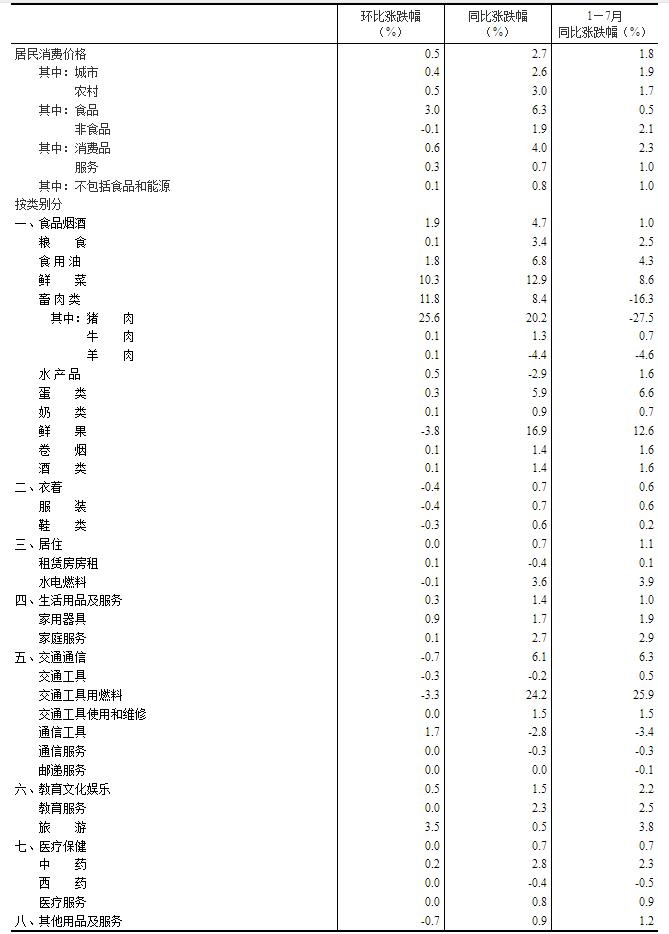 7月份,全國居民消費價格環(huán)比上漲0.5%。其中,城市上漲0.4%,農(nóng)村上漲0.5%;食品價格上漲3.0%,非食品價格下降0.1%;消費品價格上漲0.6%,服務(wù)價格上漲0.3%。