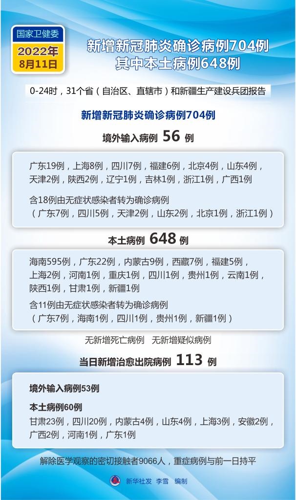 新華社北京8月12日電 國家衛(wèi)生健康委員會(huì)8月12日通報(bào),8月11日0—24時(shí),31個(gè)省(自治區(qū)、直轄市)和新疆生產(chǎn)建設(shè)兵團(tuán)報(bào)告新增確診病例704例。其中境外輸入病例56例(廣東19例,上海8例,四川7例,福建6例,北京4例,山東4例,天津2例,陜西2例,遼寧1例,吉林1例,浙江1例,廣西1例),含18例由無癥狀感染者轉(zhuǎn)為確診病例(廣東7例,四川5例,天津2例,山東2例,北京1例,浙江1例);本土病例648例(海南595例,廣東22例,內(nèi)蒙古9例,西藏7例,福建5例,上海2例,河南1例,重慶1例,四川1例,貴州1例,云南1例,陜西1例,甘肅1例,新疆1例),含11例由無癥狀感染者轉(zhuǎn)為確診病例(廣東7例,海南1例,四川1例,貴州1例,新疆1例)。無新增死亡病例。無新增疑似病例。