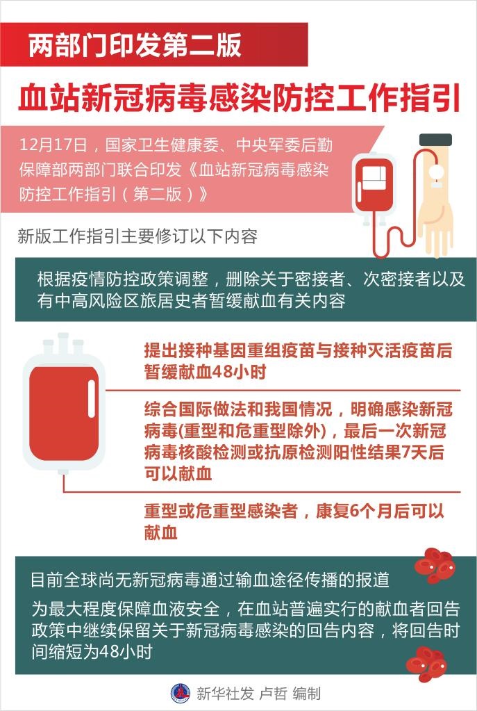 新華社北京12月17日電(記者顧天成、董瑞豐)血站新冠病毒感染防控工作事關(guān)血液安全平穩(wěn)供應(yīng)。17日,國家衛(wèi)生健康委、中央軍委后勤保障部兩部門聯(lián)合印發(fā)《血站新冠病毒感染防控工作指引(第二版)》,指導采供血機構(gòu)切實做好新形勢下疫情防控工作,保障血站工作人員和獻血者安全,實現(xiàn)血液安全供應(yīng)。