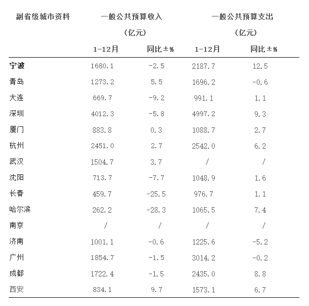 寧波市統(tǒng)計(jì)局網(wǎng)站日前公布《2022年副省級(jí)城市數(shù)據(jù)》,匯總了我國(guó)15座副省級(jí)城市2022年地區(qū)生產(chǎn)總值、增速、一般公共預(yù)算收入等指標(biāo)。