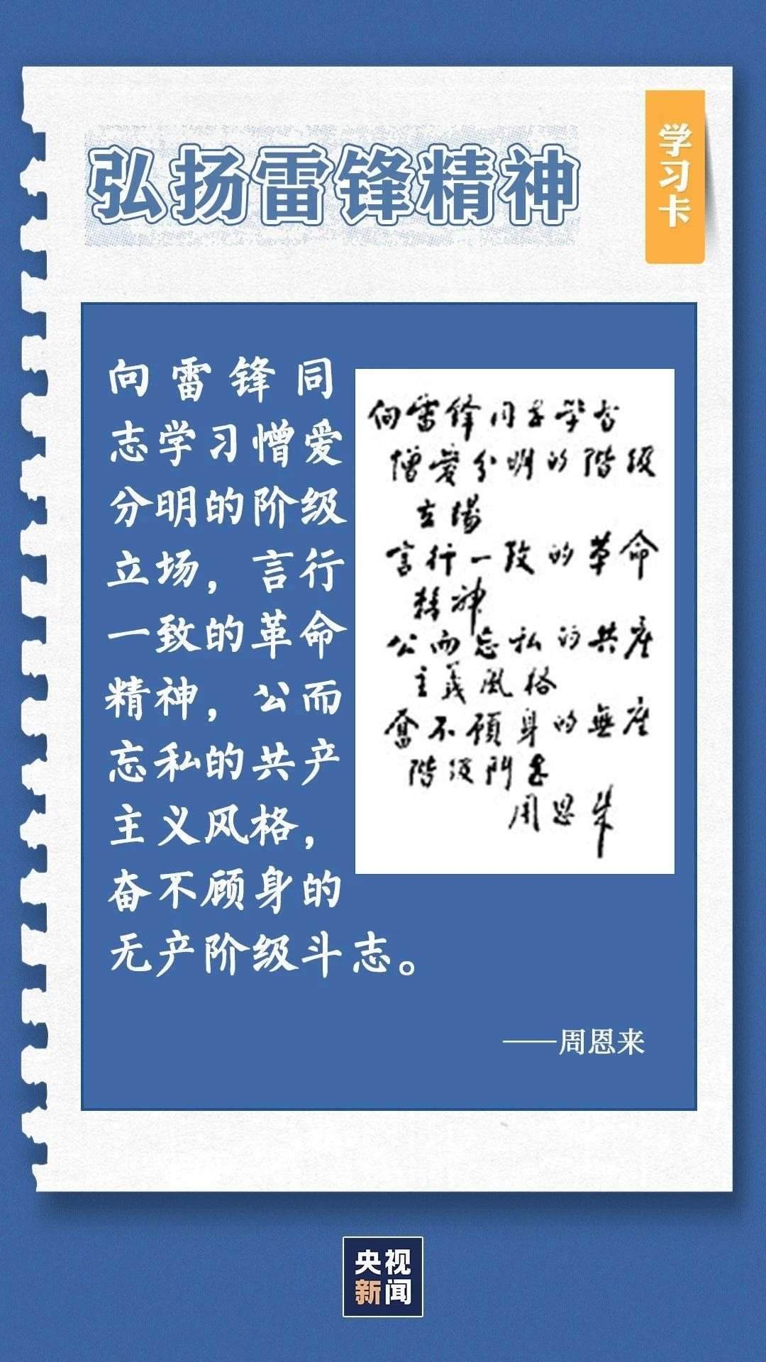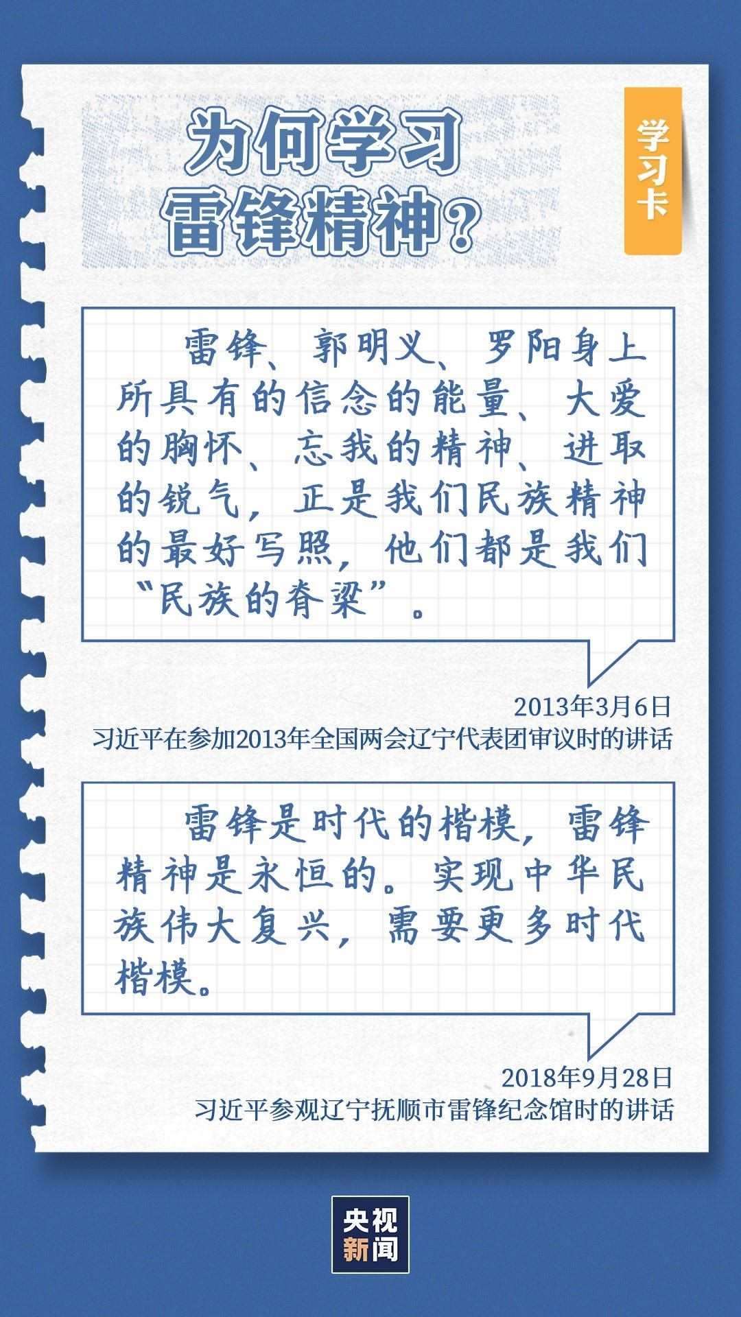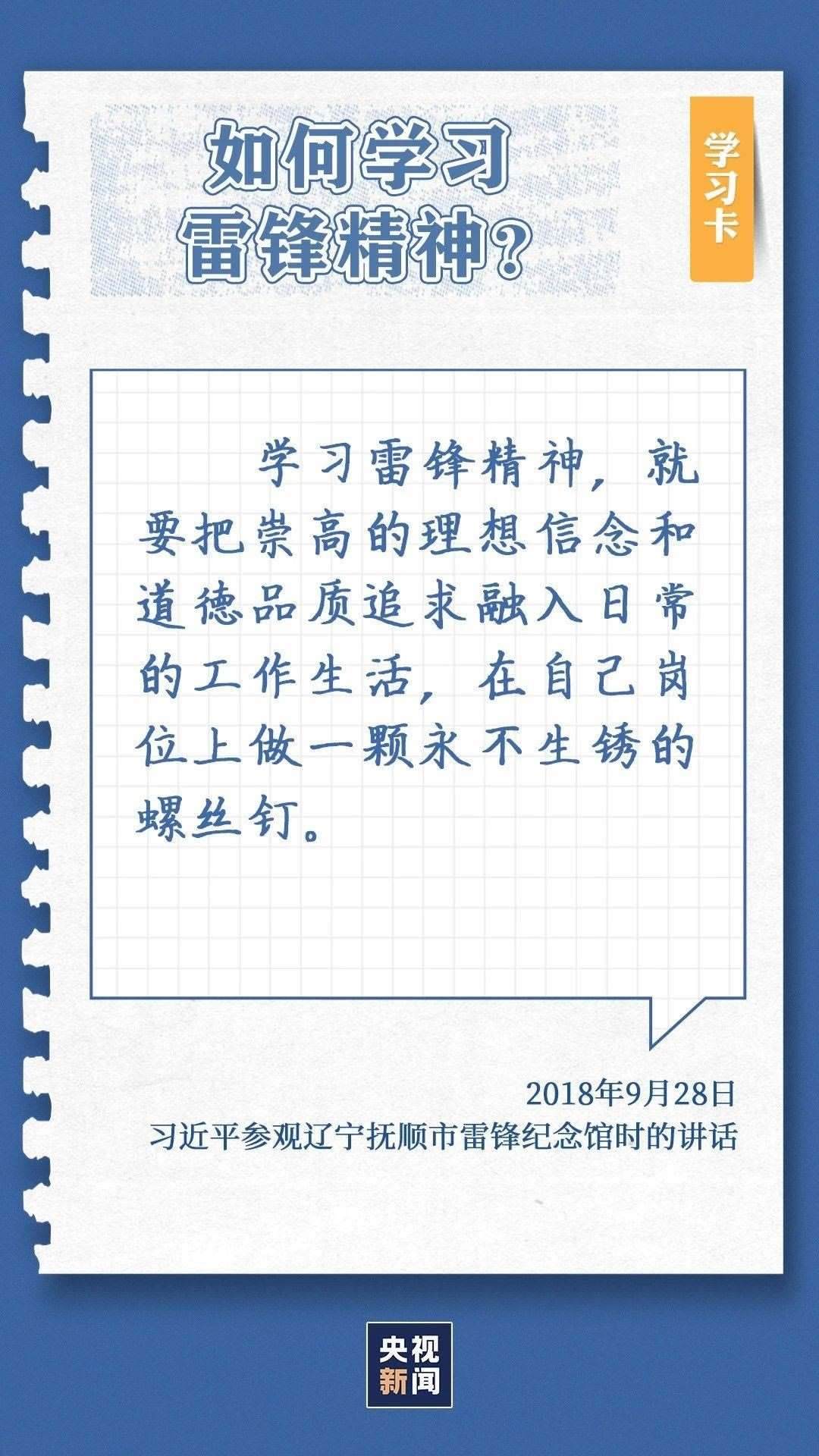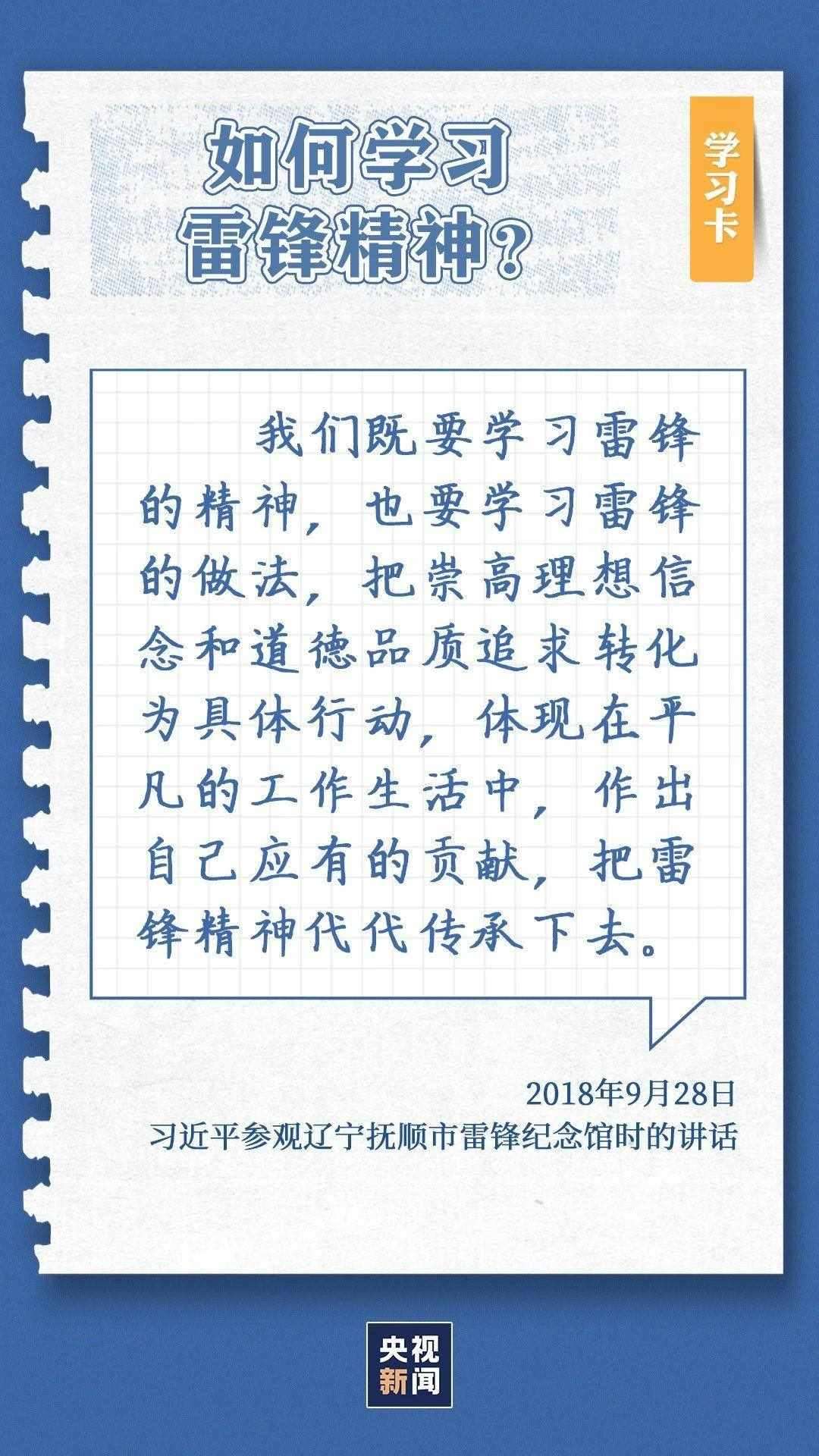 中共中央總書記、國家主席、中央軍委主席習(xí)近平近日作出重要指示指出,今年是毛澤東等老一輩革命家為雷鋒同志題詞60周年。60年來,學(xué)雷鋒活動(dòng)在全國持續(xù)深入開展,雷鋒的名字家喻戶曉,雷鋒的事跡深入人心,雷鋒精神滋養(yǎng)著一代代中華兒女的心靈。實(shí)踐證明,無論時(shí)代如何變遷,雷鋒精神永不過時(shí)。在新時(shí)代新征程上,如何弘揚(yáng)雷鋒精神?點(diǎn)擊學(xué)習(xí)卡↓
