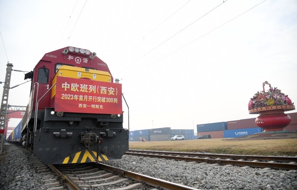 滿(mǎn)載日用百貨的X8151次中歐班列準(zhǔn)備從西安國(guó)際港站開(kāi)往白俄羅斯首都明斯克。