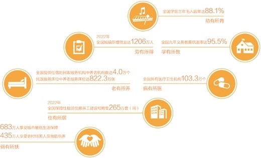 實(shí)實(shí)在在的舉措,帶來(lái)了實(shí)實(shí)在在的成效。城鄉(xiāng)學(xué)前教育公共服務(wù)體系基本建成,學(xué)前三年毛入園率由2011年的62.3%提高到2021年的88.1%。堅(jiān)持政府舉辦義務(wù)教育,九年義務(wù)教育鞏固率達(dá)95.5%,初中在校生5120.6萬(wàn)人,普通小學(xué)在校生10732.0萬(wàn)人;實(shí)施就業(yè)優(yōu)先戰(zhàn)略,確保就業(yè)局勢(shì)總體穩(wěn)定,2022年城鎮(zhèn)新增就業(yè)達(dá)1206萬(wàn)人,脫貧人口務(wù)工規(guī)模3278萬(wàn)人,100個(gè)城市公共就業(yè)服務(wù)機(jī)構(gòu)求人倍率為1.46,繼續(xù)保持在1以上,崗位供給大于求職人數(shù);著力解決群眾看病難、看病貴問(wèn)題,人民健康水平穩(wěn)步提升,全國(guó)共有醫(yī)療衛(wèi)生機(jī)構(gòu)103.3萬(wàn)個(gè),醫(yī)療衛(wèi)生機(jī)構(gòu)床位975萬(wàn)張,參加基本醫(yī)療保險(xiǎn)人數(shù)達(dá)到134570萬(wàn)人;不斷推進(jìn)養(yǎng)老事業(yè)和養(yǎng)老產(chǎn)業(yè)協(xié)同發(fā)展,養(yǎng)老服務(wù)體系更加健全,全國(guó)提供住宿的民政服務(wù)機(jī)構(gòu)中養(yǎng)老機(jī)構(gòu)達(dá)4.0萬(wàn)個(gè),民政服務(wù)床位中養(yǎng)老服務(wù)床位達(dá)822.3萬(wàn)張;加快推進(jìn)住房保障和供應(yīng)體系建設(shè),2022年全年全國(guó)各類棚戶區(qū)改造開工134萬(wàn)套,基本建成181萬(wàn)套,全國(guó)保障性租賃住房開工建設(shè)和籌集265萬(wàn)套(間),群眾居住條件不斷改善;扎實(shí)做好因疫因?yàn)?zāi)遇困群眾和老弱病殘等特殊群體的基本生活保障,2022年年末,683萬(wàn)人享受城市最低生活保障,435萬(wàn)人享受農(nóng)村特困人員救助供養(yǎng),全年臨時(shí)救助1083萬(wàn)人次,保障網(wǎng)越織越密實(shí)。