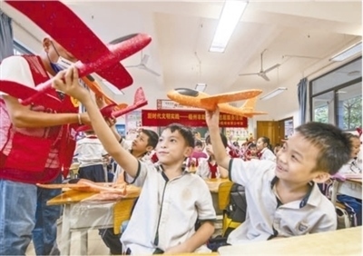 廣西壯族自治區(qū)梧州市的一所小學(xué)內(nèi),學(xué)生正在上趣味航模科技課。何華文攝(影像中國(guó))