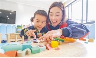 浙江省湖州市德清縣阜溪街道興山未來(lái)社區(qū)嬰幼兒照護(hù)驛站,幼兒在志愿者指導(dǎo)下拼搭積木。王樹成攝(影像中國(guó))