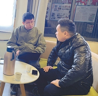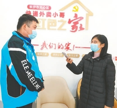 湖南分社記者王云娜(右)在湖南省長(zhǎng)沙市天心區(qū)坡子街街道楚湘社區(qū)“快遞外賣(mài)小哥紅色之家”采訪。 李蔓蔓攝