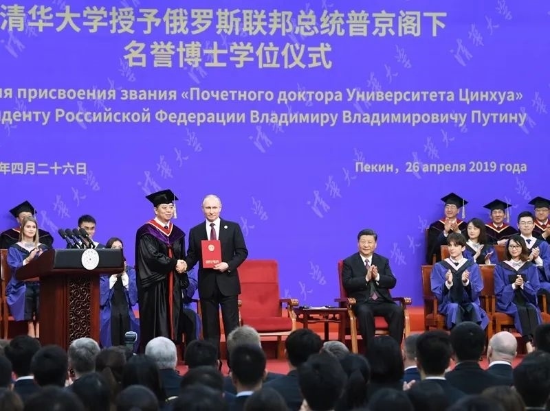 2019年4月,普京總統(tǒng)率團(tuán)來華,出席第二屆“一帶一路”國(guó)際合作高峰論壇。期間,在北京友誼賓館,中方還有一項(xiàng)特殊安排:清華大學(xué)向普京總統(tǒng)授予名譽(yù)博士學(xué)位。