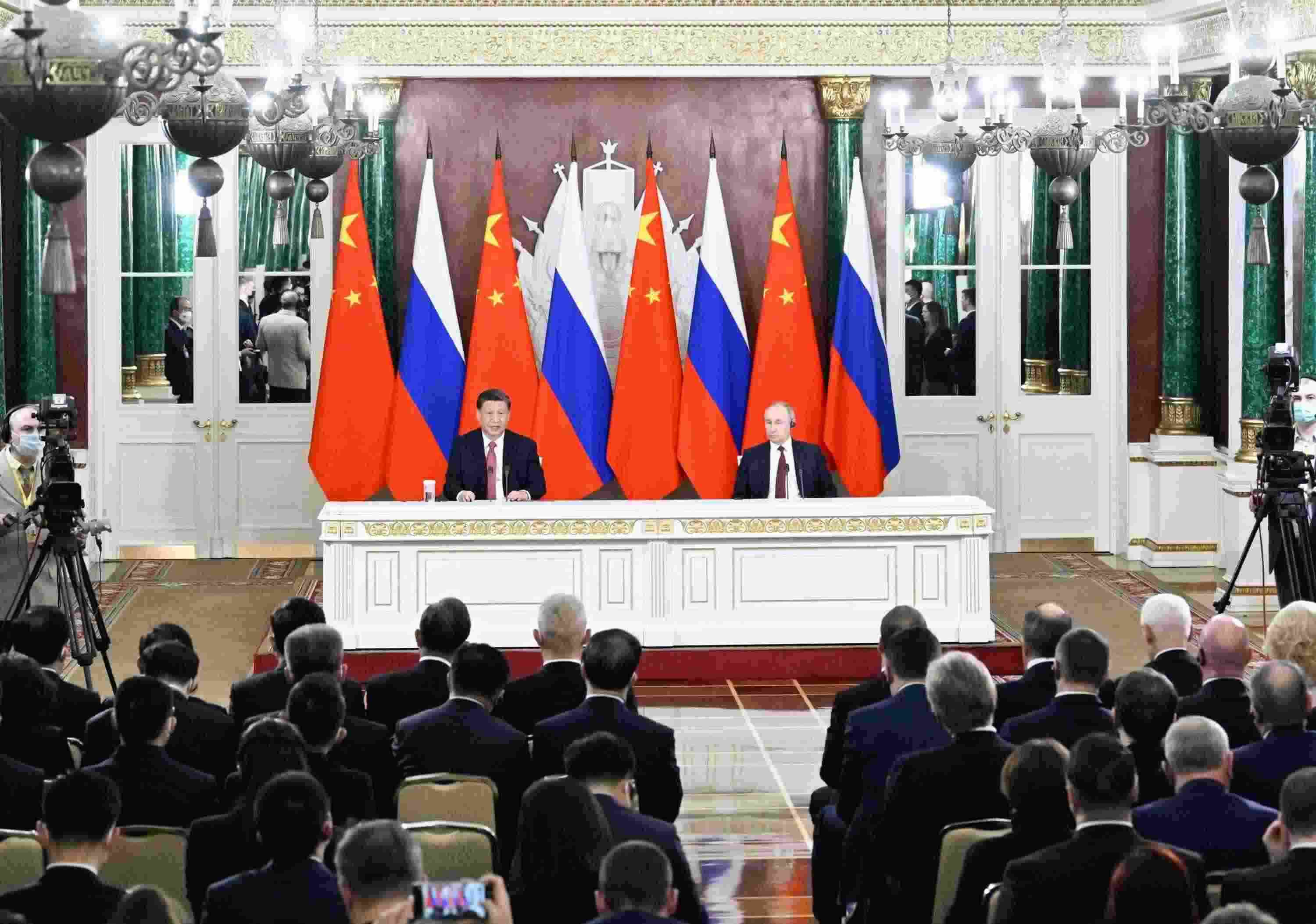 當(dāng)?shù)貢r(shí)間3月21日下午,國(guó)家主席習(xí)近平在莫斯科克里姆林宮同俄羅斯總統(tǒng)普京舉行會(huì)談。這是會(huì)談后,兩國(guó)元首共同會(huì)見(jiàn)記者。