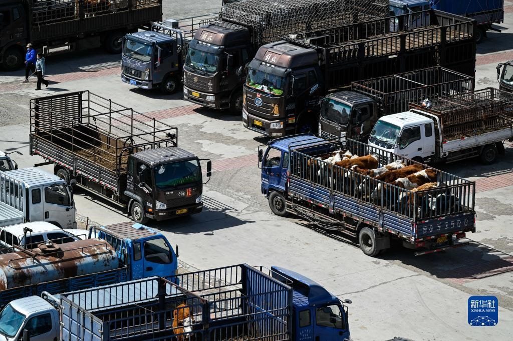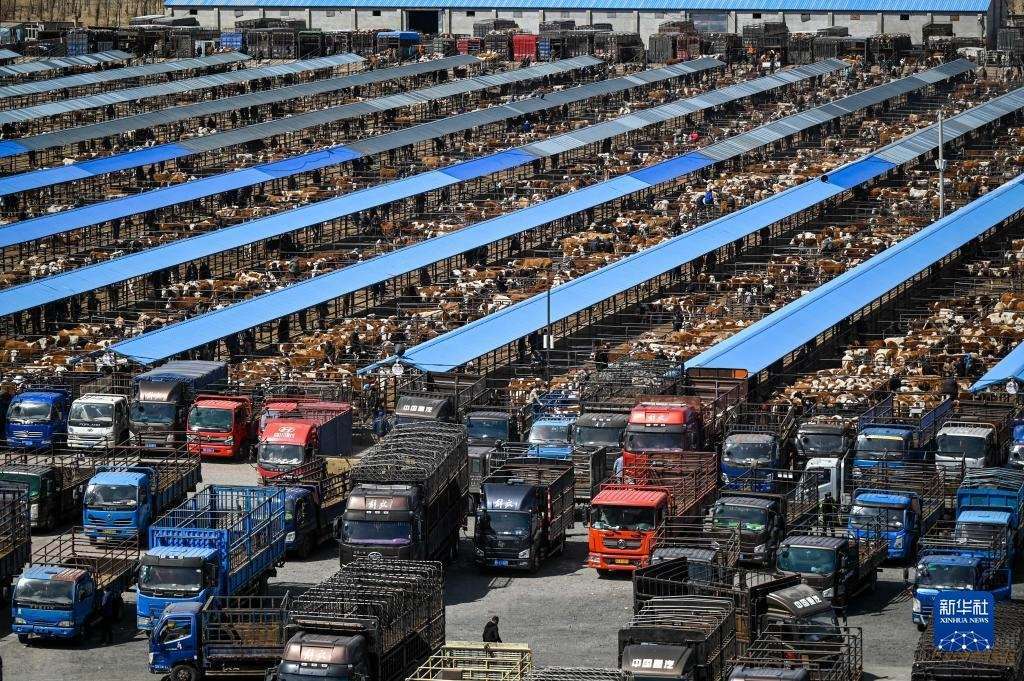 4月12日,內(nèi)蒙古通遼市科爾沁左翼中旗舍伯吐鎮(zhèn)成峰牲畜交易市場里一片繁忙景象,1000余輛貨運(yùn)車整齊排列,1萬余頭黃牛正等待被交易。據(jù)介紹,這個交易市場年交易80萬頭肉牛,交易額可達(dá)80億元。今年以來,當(dāng)?shù)嘏J行星橹饾u轉(zhuǎn)好,來自遼寧、吉林、山東等地的買家再次聚集于此,帶動了養(yǎng)殖戶增收。新華社記者 連振 攝