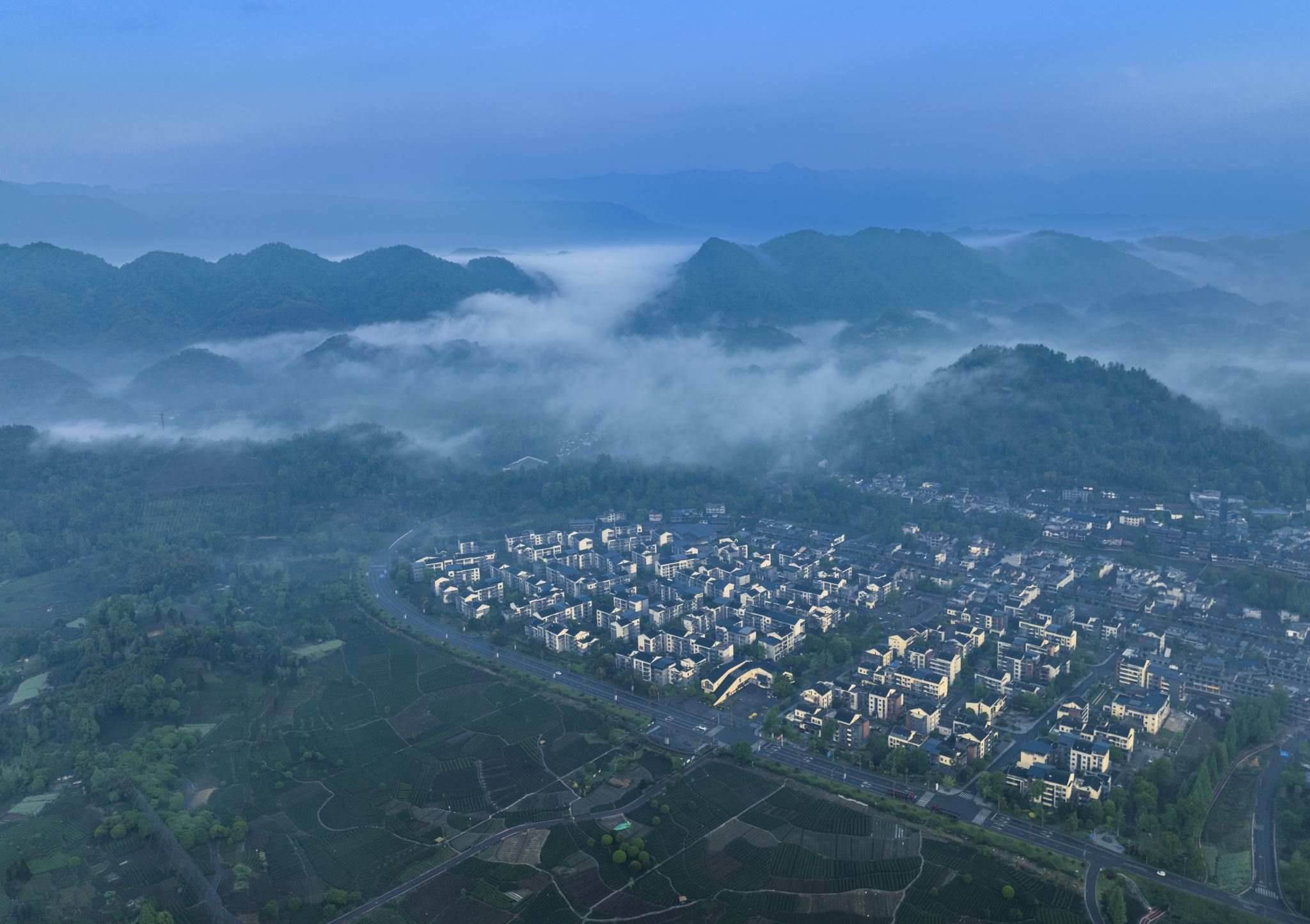 成都:鄉(xiāng)村薄霧輕旋 青山蒼翠