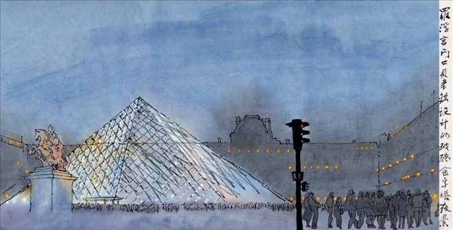 羅浮宮門口貝聿銘設(shè)計的玻璃金字塔夜景   35cm×68cm 1993 年