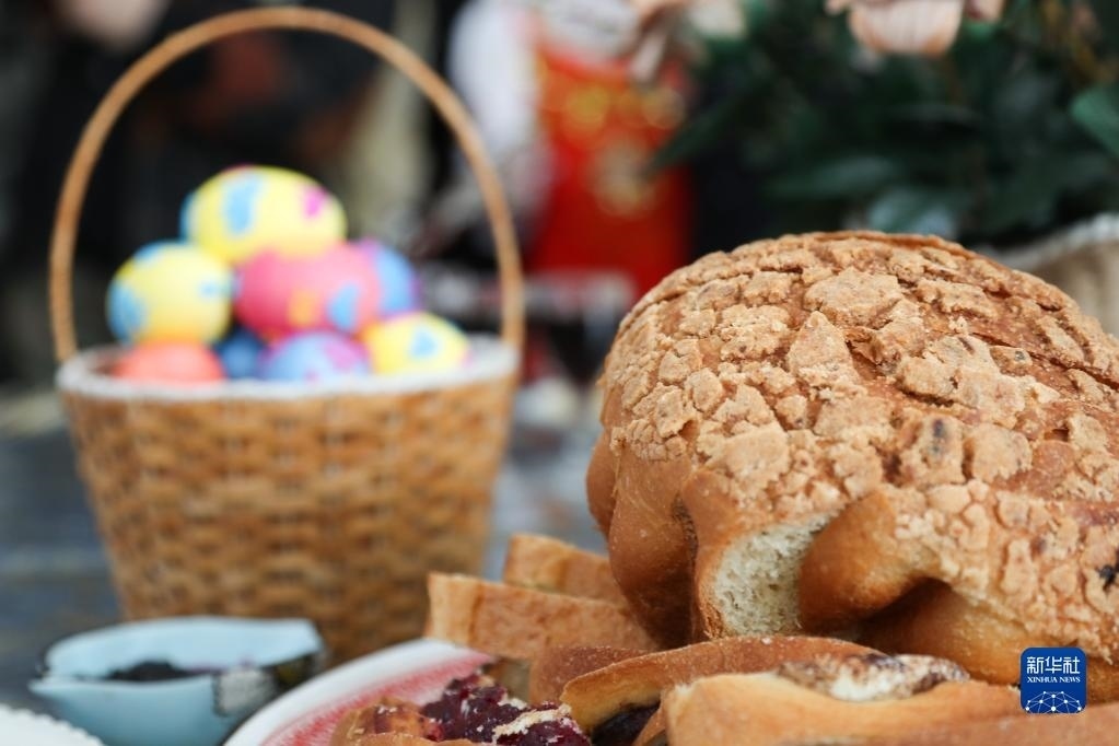4月16日拍攝的當(dāng)?shù)厝罕姙橛影退箍斯?jié)準備的美食和彩蛋。   新華社記者 王楷焱 攝